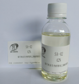 SA-42 是一种性能优异反应型乳化剂,具有优异的乳化能力,同时又具有C=C双键,能与丙烯酸单体进行共聚,可大大提高乳液的耐水性能,及降低聚合过程的出渣率。它在一个分子中同时集合了极性的阴离子、及反应型基团和非极性的非离子基团,这种独特的分子结构同时具有静电和空间稳定作用,使乳液具有很好的电解质稳定性和机械稳定性。