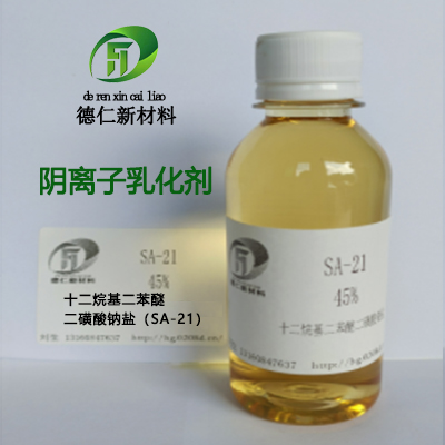 SA-21在乳液聚合中可作为主乳化剂使用,由于本身具有优异的乳化能力,可使乳胶具有颗粒小,分布均匀,存放稳定,凝胶少等优点。可提高其耐水白、耐化性、耐盐雾、耐擦洗性。在皮革浸制中作为润湿剂,在脂肪浸水中作为渗透剂。