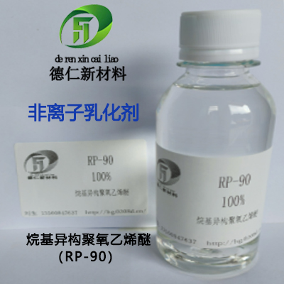 RP90是线型乙氧基脂肪醇醚,它的HLB=13,是壬基酚类表面活性剂的环保替代品。它可溶于水中,能和大多数溶剂相容,可生物降解。RP90可和多数阴离子和非离子表面活性剂复配,用于特殊乳液生产,具有低凝胶、低泡、低倾点,提高配方的冻融稳定性。
