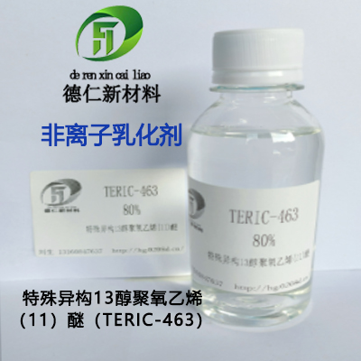 TERIC-463用作非离子型乳化剂,用于丙烯酸酯,苯乙烯-丙烯酸酯和乙酸乙烯酯等单体的乳液聚合。它能够替代烷基酚的不环保型乳化剂,吸咐面积大;能够提供乳液良好的聚合、化学、机械、冻融等稳定性,极易溶于冷水;能够替代含35-45EO的烷基酚聚氧乙烯醚的非离子。在不同的剪切速率下能保持聚合物乳液的低粘度、增强电解质稳定性、延长保质期、极优抗冻融稳定性。