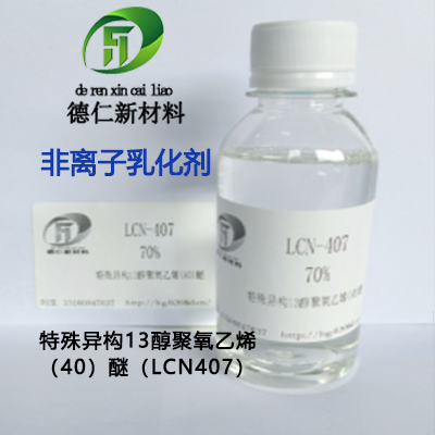 LCN-407用作非离子型乳化剂,用于丙烯酸酯,苯乙烯-丙烯酸酯和乙酸乙烯酯等单体的乳液聚合。它能够替代烷基酚的不环保型乳化剂,吸咐面积大;能够提供乳液良好的聚合、化学、机械、冻融等稳定性,极易溶于冷水;能够替代含35-45EO的烷基酚聚氧乙烯醚的非离子。在不同的剪切速率下能保持聚合物乳液的低粘度、增强电解质稳定性、延长保质期、极优抗冻融稳定性。