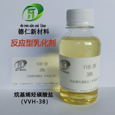 VVH-38适用于防水乳液、内外墙乳液、覆膜胶乳液、植绒胶乳液、印花胶浆乳液的水性丙烯酸乳液聚合中,可作为主乳化剂使用。