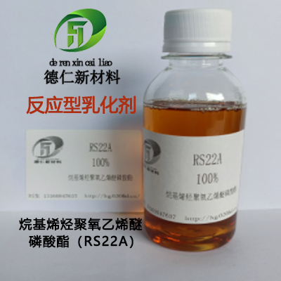 RS22A 是一种性能优异反应型乳化剂,具有优异的乳化能力,同时又具有C=C双键,能与丙烯酸单体进行共聚,可大大提高乳液的耐水性能,及降低聚合过程的出渣率。它具有优良的聚合物稳定性能、很好地控制粒径尺寸大小、改善高分子薄膜的耐腐蚀性能、改善高分子薄膜的热稳定性和光稳定性。
